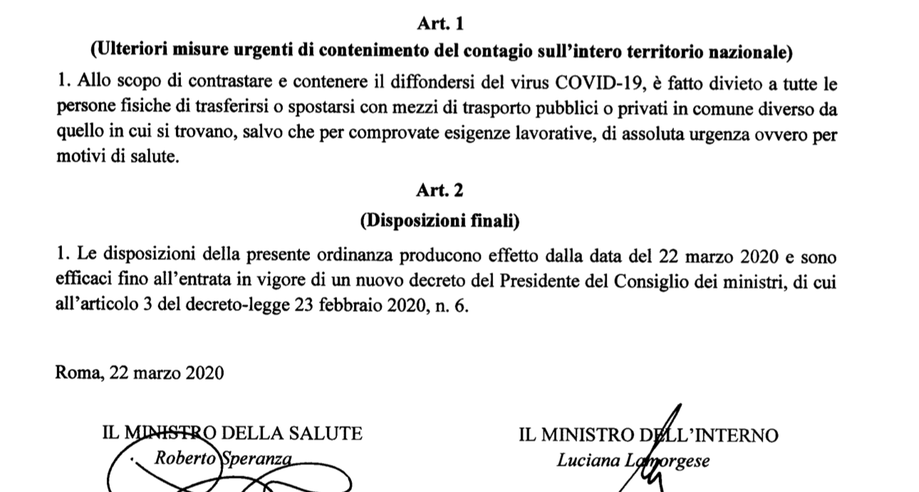 Nuova stretta contro il Covid-19 con il blocco degli spostamenti dal proprio Comune di residenza o dal Comune in cui ci si trova. Il divieto è previsto dal decreto firmato nella serata di ieri dal Presidente del Consiglio Conte tramite l’rdinanza emessa dai ministri Lamorgese e Speranza.