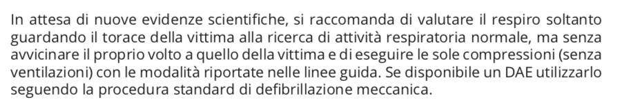 Recita infatti il testo del documento pubblicato dall’Istituto nazionale Assicurazione Infortuni sul Lavoro “in attesa di nuove evidenze scientifiche, si raccomanda di valutare il respiro soltanto guardando il torace della vittima alla ricerca di attività respiratoria normale, ma senza avvicinare il proprio volto a quello della vittima e di eseguire le sole compressioni (senza ventilazioni) con le modalità riportate nelle linee guida. Se disponibile un DAE utilizzarlo seguendo la procedura standard di defibrillazione meccanica“.