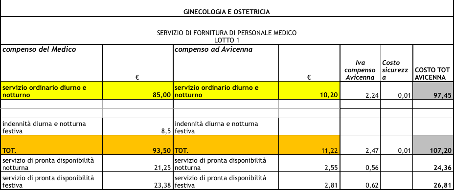 Di questi importi, una parte è il compenso del medico (euro 85/93,50) e il resto è il compenso di competenza di Avicenna sul quale va calcolata l’Iva, indetraibile per l’Ente, e una piccola quota di costi di sicurezza.