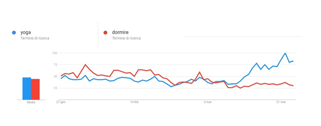 La voglia di rimanere attivi e fare attività fisica non abbandona gli italiani neanche tra le mura domestiche. Dalle ricerche effettuate possiamo constatare che l’approccio attivo ha riportato una brillante vittoria su quello passivo: la parola “yoga”, infatti, ha prima raggiunto e poi lasciato indietro la parola “dormire”.