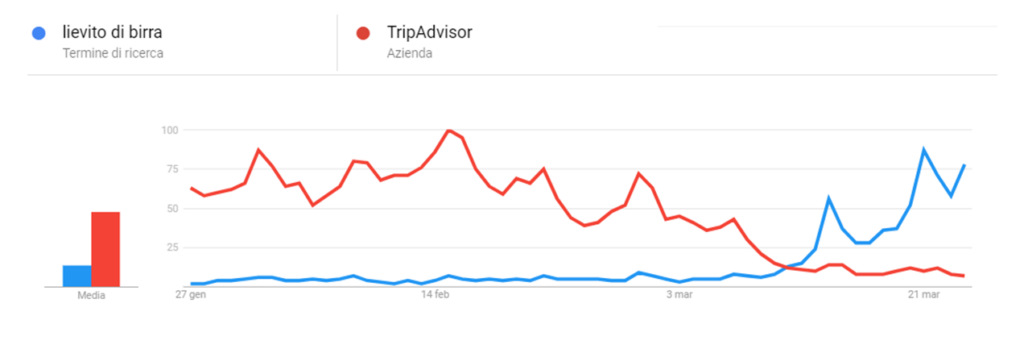 In supermercato le scorte sono in continuo esaurimento, ma gli italiani non mollano: anche questo se lo preparano da soli a casa. Ecco il tasso di crescita di questa parola chiave su Google, messa a confronto con “Tripadvisor”, l’oracolo degli italiani quando devono provare un nuovo ristorante.