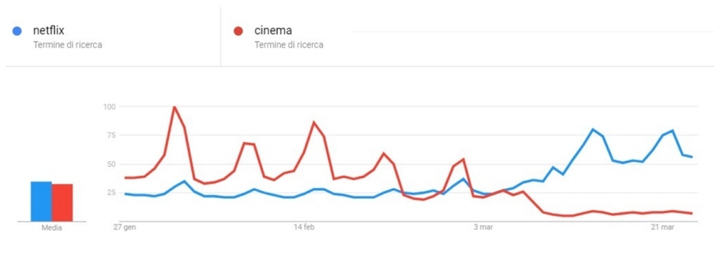 Se paragoniamo la parola “Netflix” a “cinema”, il confronto in termini di ricerca è impietoso. Ma… solo a condizione che ci sia una connessione internet stabile e veloce!