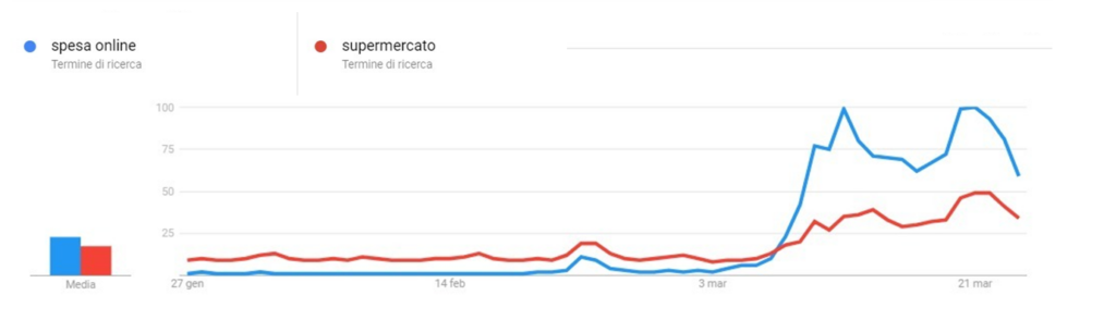 Dalle ricerche effettuate possiamo vedere come la parola “spesa online” ha superato la parola “supermercato” in quest’ultimo periodo.