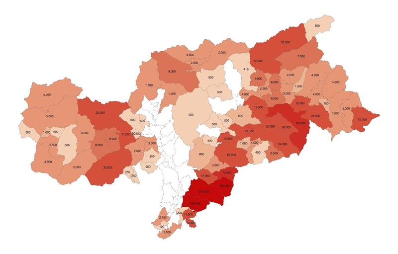 Due terzi di essi sono distribuiti fra 6 Comuni: Nova Levante (361.000 metri cubi), Nova Ponente (270.000 mc), Aldino (194.000 mc), Tires (72.000 mc), Marebbe (60.000 mc) e Castelrotto (40.000 mc).
