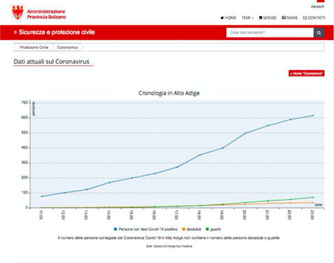 Un grafico illustra inoltre il numero di persone risultate positive dopo essere state sottoposte a tampone, il numero dei guariti e dei deceduti. I dati sono aggiornati quotidianamente dell’Azienda Sanitaria dell’Alto Adige e dall’Agenzia provinciale per la Protezione Civile.