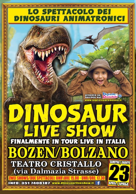 Sabato 23 aprile al teatro Cristallo andrà in scena il Dinosaur Live Show, uno spettacolo unico nel suo genere in Italia e che per la prima volta arriva nella città di Bolzano.