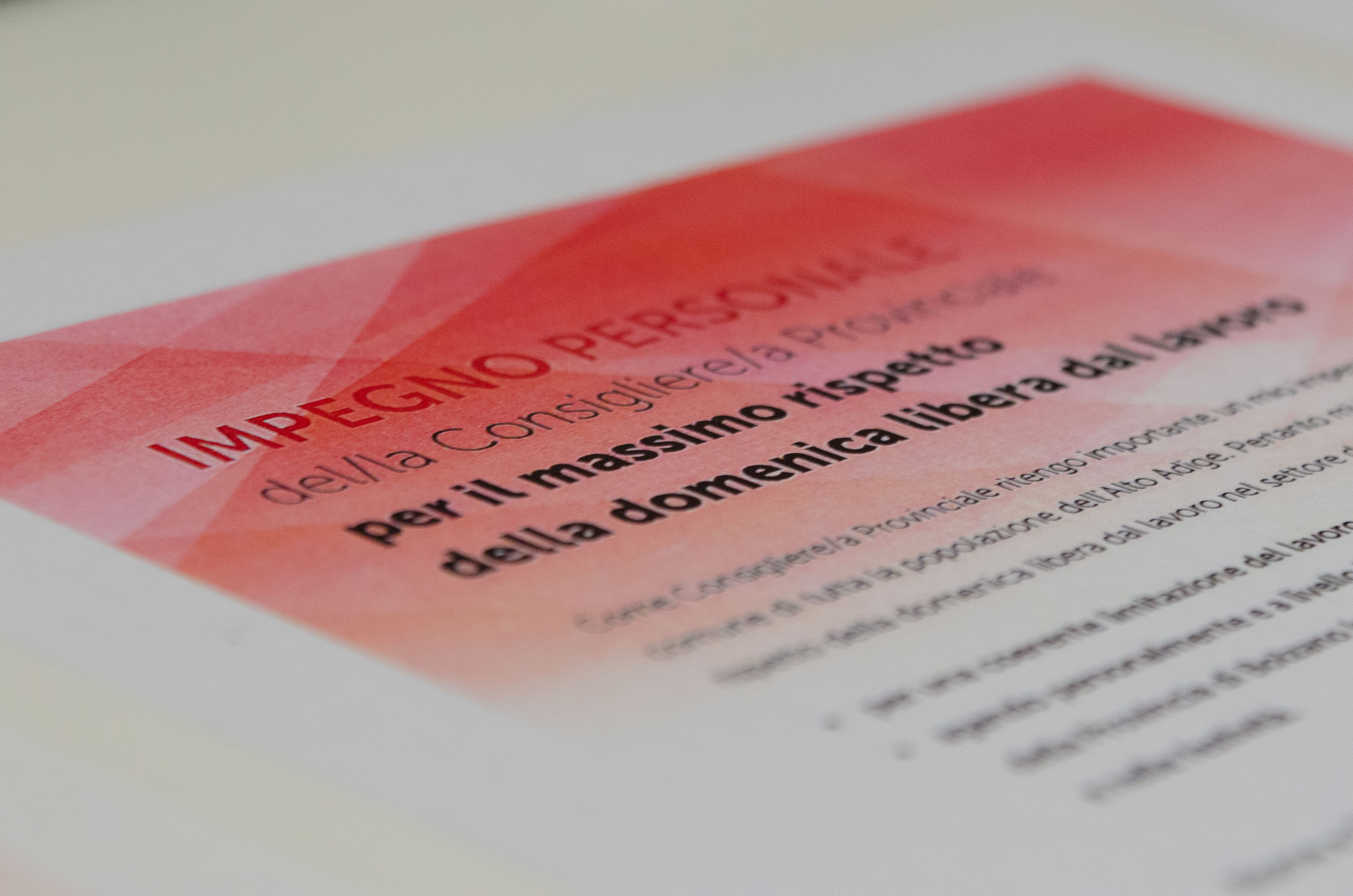 Per tutti questi motivi è stata lanciata la nuova azione “Impegno personale“: il pastore della chiesa evangelica-luterana di Bolzano, Michael Jäger, ha letto l‘autodichiarazione di intenti sottoscritta dai 16 Consiglieri provinciali e ha ribadito l’importanza del ruolo delle istituzioni politiche in questa battaglia per la salvaguardia della domenica come giorno di riposo per la famiglia e per il singolo.
