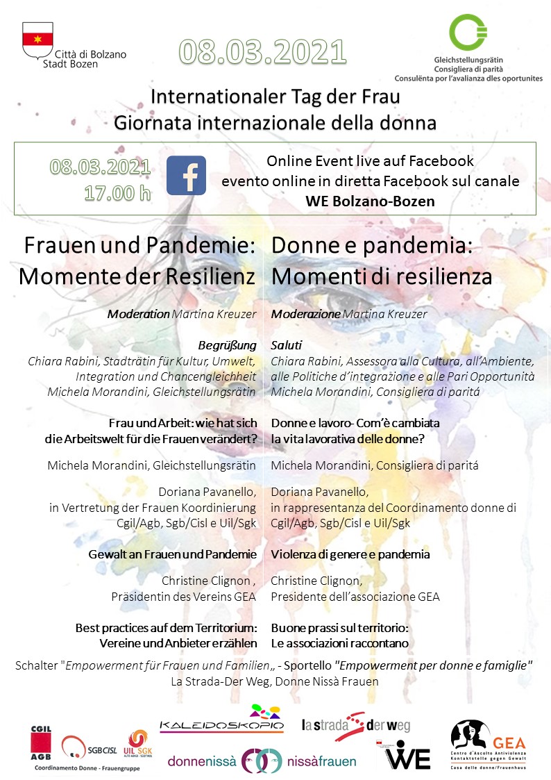 Se ne parla in un incontro intitolato “Donne e pandemia – Momenti di resilienza“, che si terrà l’8 marzo dalle 17.00 e potrà essere seguito sulla pagina Facebook WE- Bolzano Bozen (vengono date opportunità di partecipazione attiva).