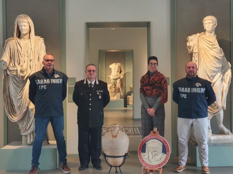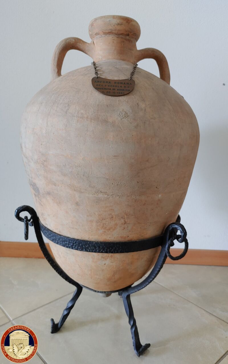 Il 21 gennaio 2025, ad Aquileia, i Carabinieri del Nucleo Tutela Patrimonio Culturale di Udine hanno consegnato al Museo Archeologico Nazionale un’anfora romana in terracotta, risalente al I sec. d.C., prelevata illecitamente nel 1961 ed individuata nell’abitazione di un privato cittadino residente a Trento.