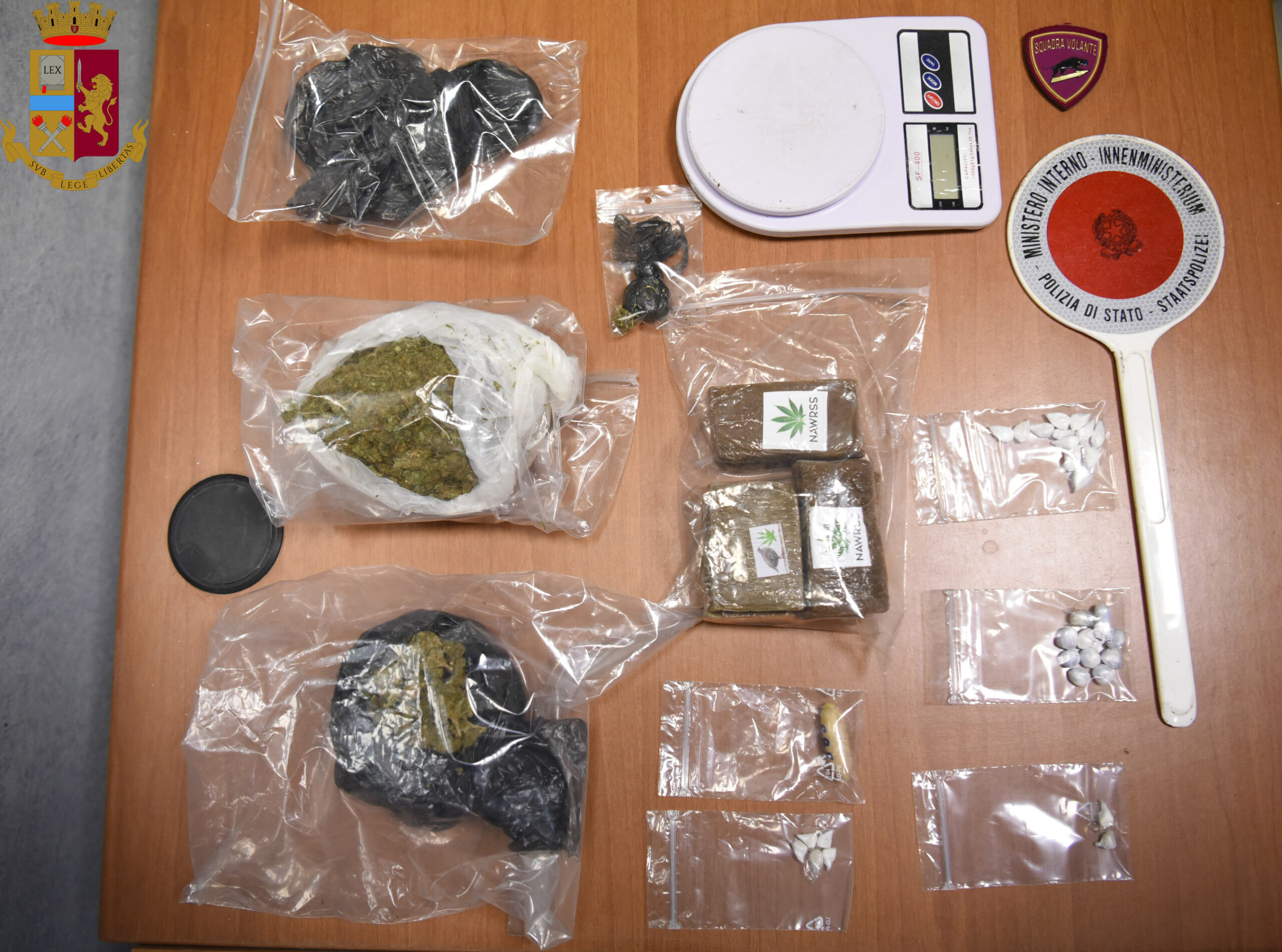 Pochi metri dopo è stato bloccato ed ammanettato. All’interno del borsello, immediatamente recuperato, c’erano vari involucri in cellophane contenenti 312,12 grammi di hashish e 24,28 grammi di marijuana, oltre a cinque telefoni cellulari, una piccola somma di denaro contante ed una lama per taglierino della lunghezza di oltre 8 centimetri.