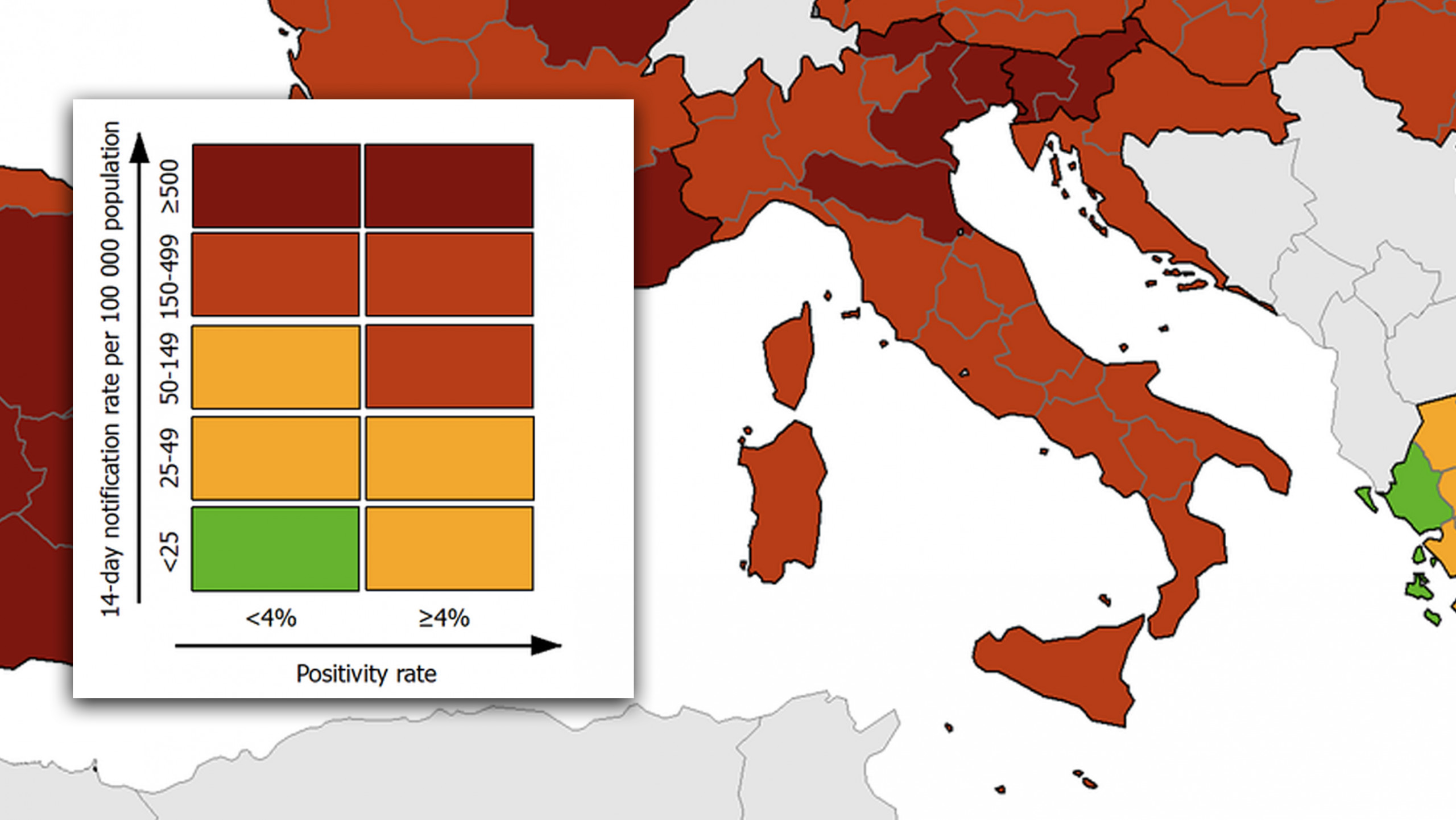 Le ‘zone rosso scuro’ rappresentano la categoria aggiunta che indica le aree in cui il Covid circola a livelli molto elevati. Il nuovo colore si applicherebbe a un’area in cui il numero cumulativo di casi, ogni 100 mila abitanti negli ultimi 14 giorni, è superiore a 500.