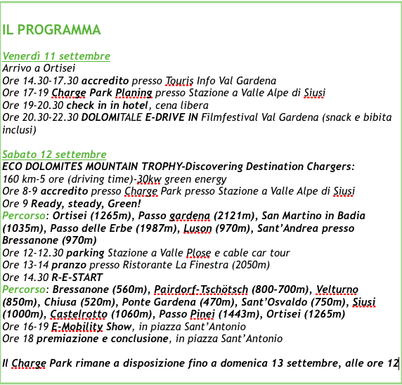 A organizzare il tour-evento dedicato ai possessori di mezzi elettrici è come sempre, anzi più che mai, ECOmove, associazione altoatesina per la salvaguardia dell’ambiente, impegnata nella sensibilizzazione alle alternative ai motori a scoppio, in particolare nel settore turistico che è sinonimo di alta mobilità.