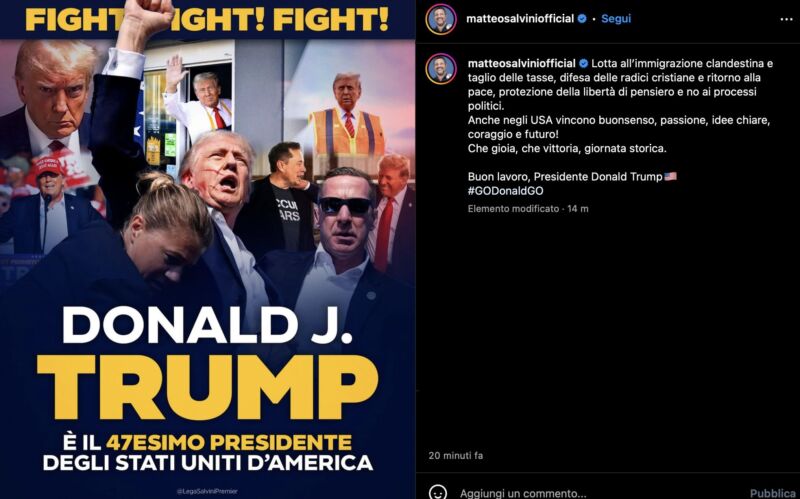 Matteo Salvini ha espresso il suo sostegno a Trump su Instagram, elogiando la scelta americana: “negli Usa vincono buonsenso, passione e futuro”.
