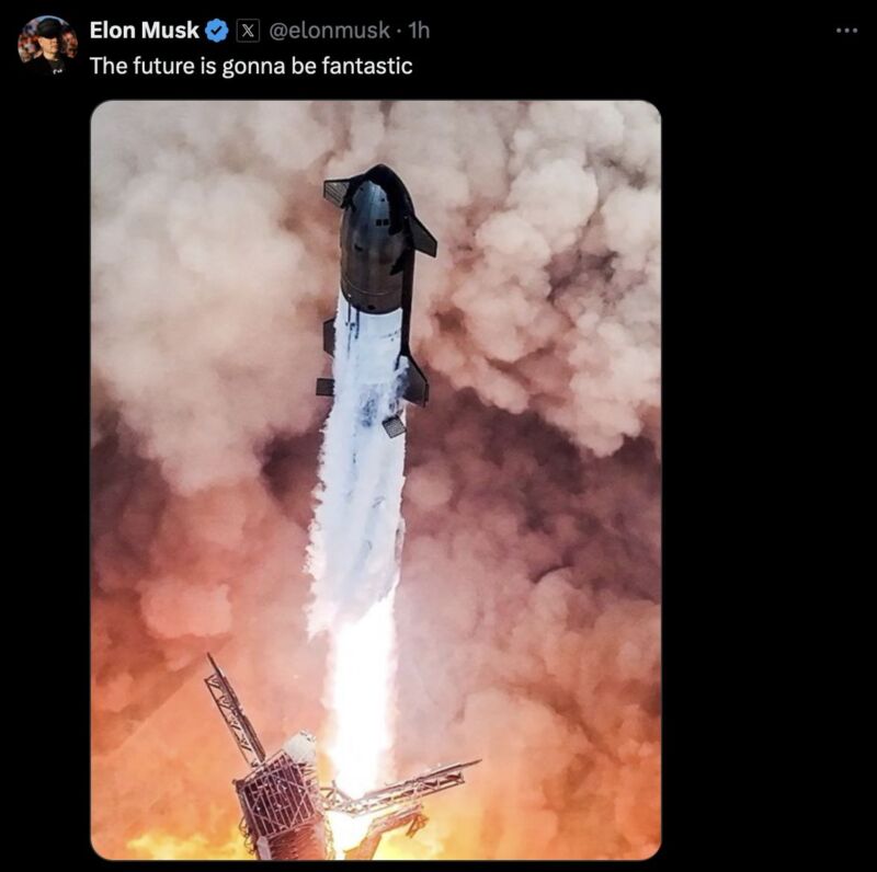 Elon Musk ha festeggiato il risultato condividendo una foto di un razzo in decollo su X, con la frase: “Il futuro sarà fantastico“.