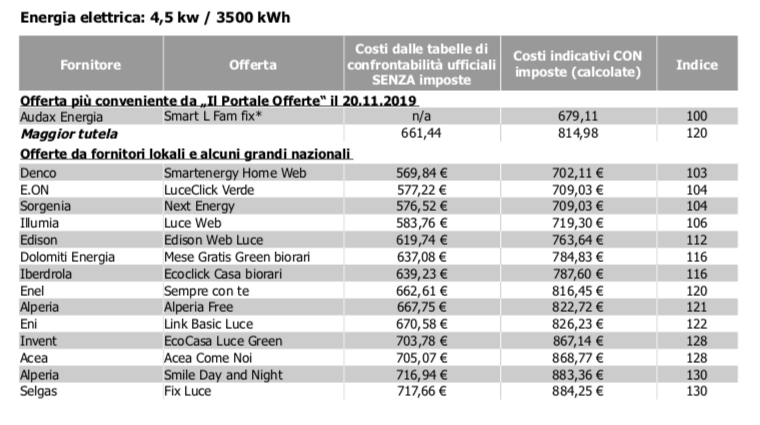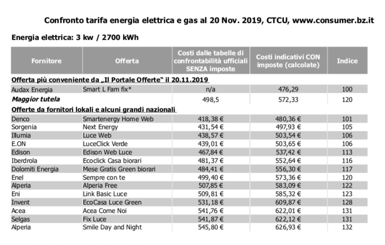 Anche per questo motivo, il Centro Tutela Consumatori Utenti (CTCU) raffronta di tanto in tanto le offerte tariffarie di alcuni fra i maggiori fornitori nazionali e di alcune aziende locali, al fine di offrire ai consumatori locali una possibilità più mirata di confronto dei prezzi dell’energia e del gas nella nostra provincia.