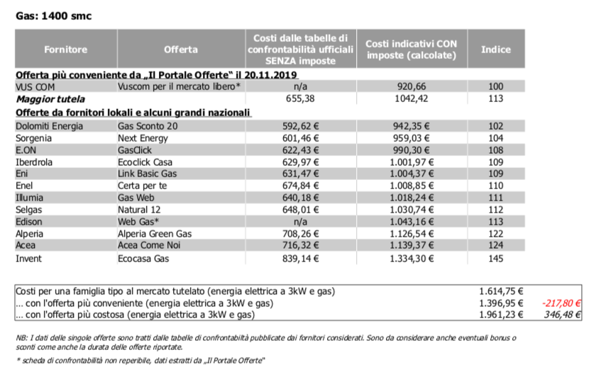 Una famiglia-tipo, residente in Alto Adige, con un contratto con potenza contrattuale di 3 kW, e con consumi di energia di 2.700 kWh e di gas per 1.400 smc, spende all’anno circa 1.615 euro sul mercato tutelato. Il passaggio alla tariffa più conveniente del nostro confronto permette un risparmio del 13,50%, cioè 218 euro all’anno.