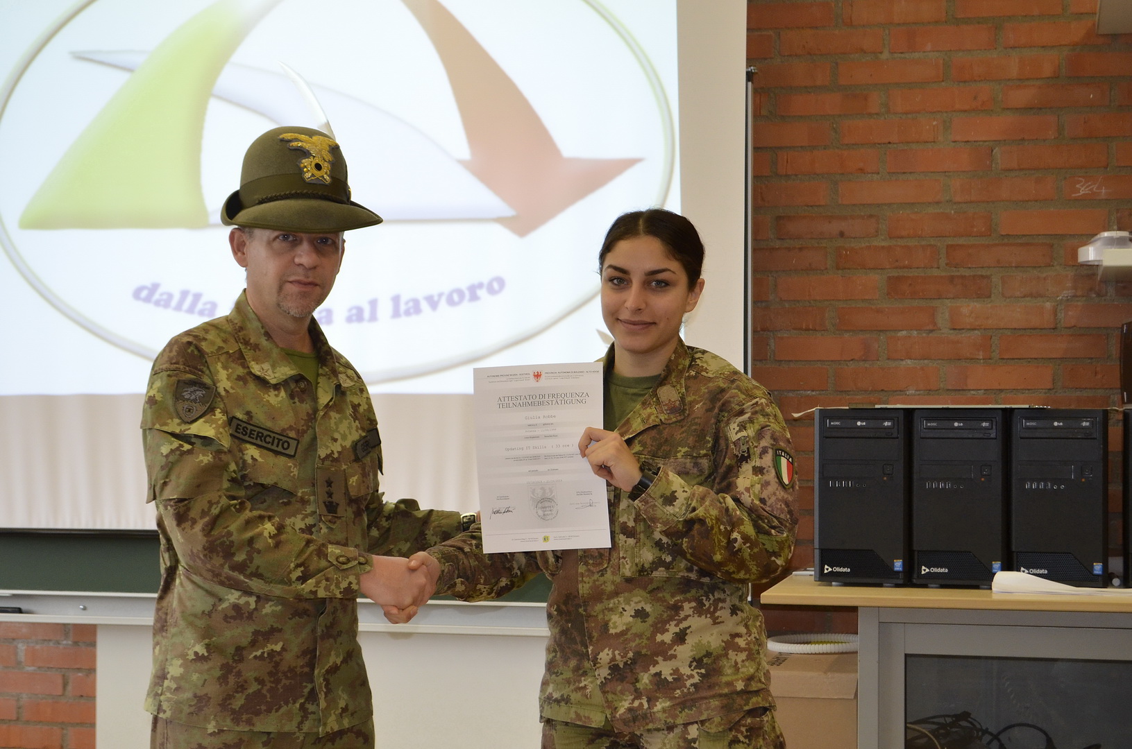 Si è tenuta presso il Centro di Formazione Professionale della Provincia Autonoma di Bolzano, la cerimonia conclusiva della prima edizione di un corso d’informatica particolarmente innovativo sul panorama nazionale, denominato “Information Technology updating Skills” e che ha visto la partecipazione di varie categorie di militari in ferma prefissata, selezionati attraverso specifici colloqui, tenuti da personale del Comando Truppe Alpine con la qualifica di Orientatore professionale.