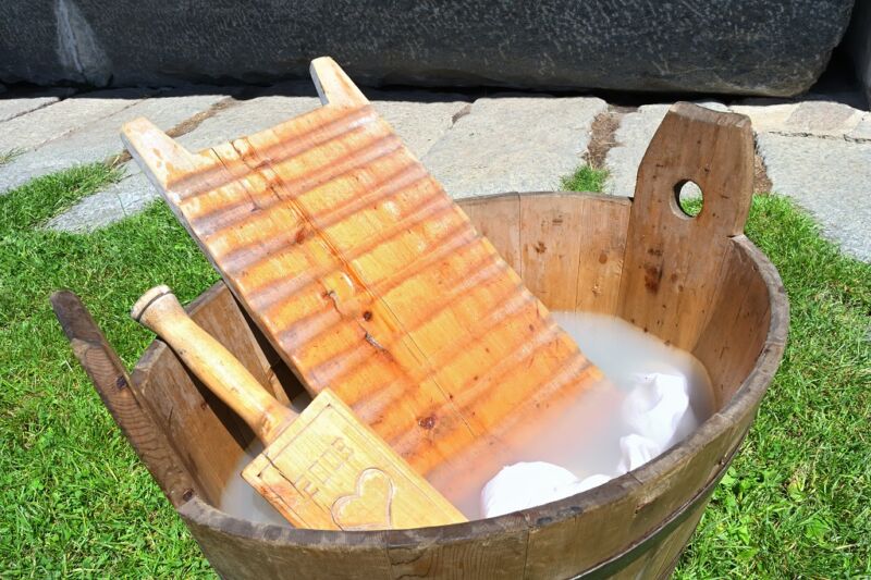 Con un asse da bucato, bastone per il bucato, spazzola e sapone veniva eliminato lo sporco. Dopo aver sciacquato il bucato in acqua fredda e aver strizzato il bucato – operazione molto faticosa – i panni perfettamente puliti potevano finalmente essere stesi ad asciugare su di un lungo filo all’aria aperta.