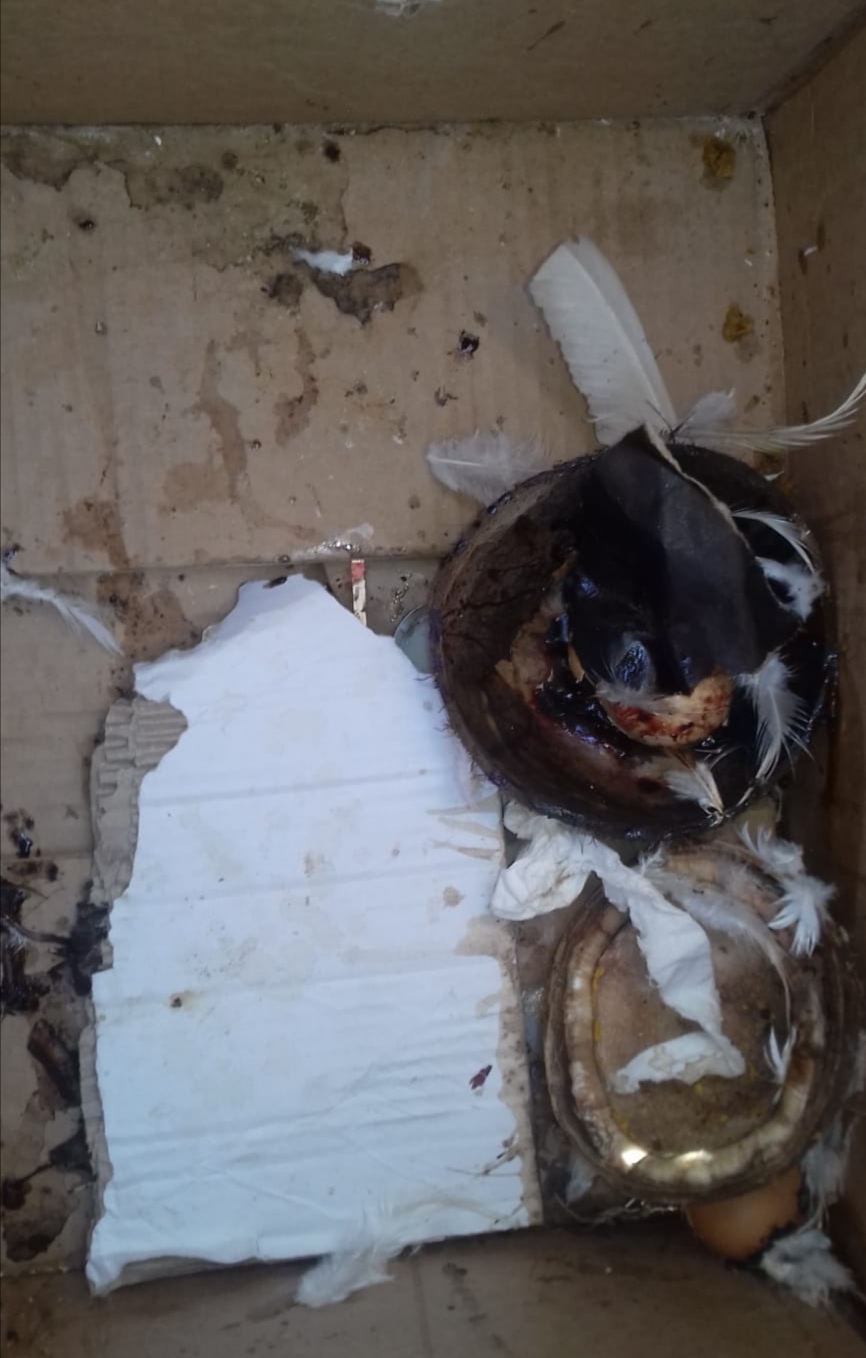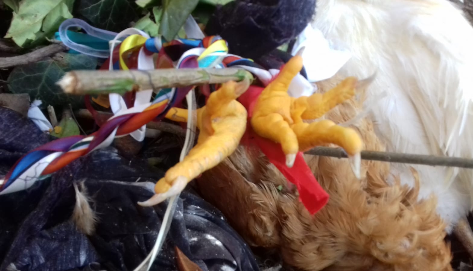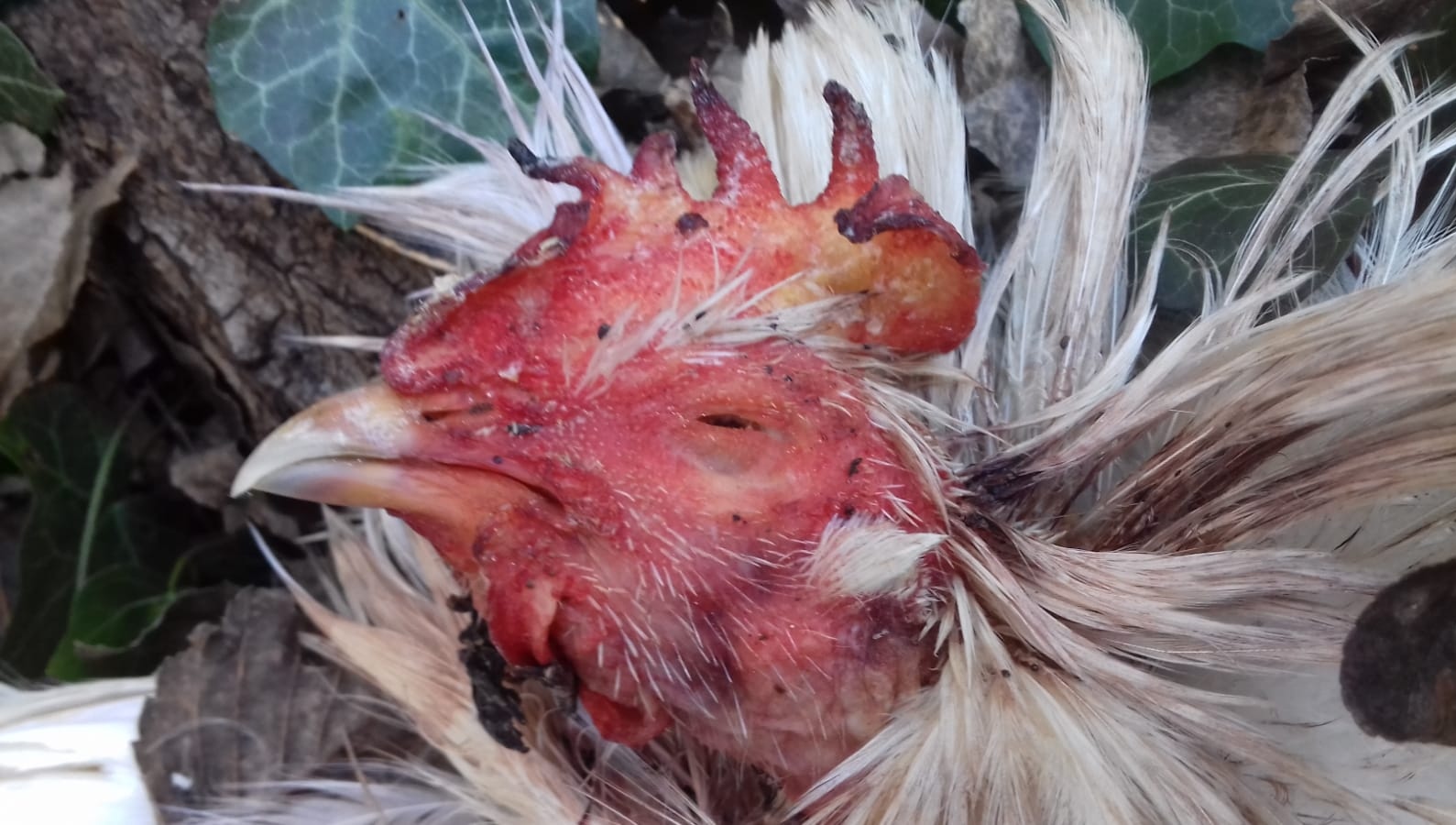 Un’analisi attenta delle immagini suggerisce che si tratti di galline da combattimento, cioe con 4 artigli. Due di queste sono bianche. Quella non bianca ha le zampe legate con i nastrini colorati, delle 2 bianche una è decapitata, l’altra ha l’osso del collo spezzato.