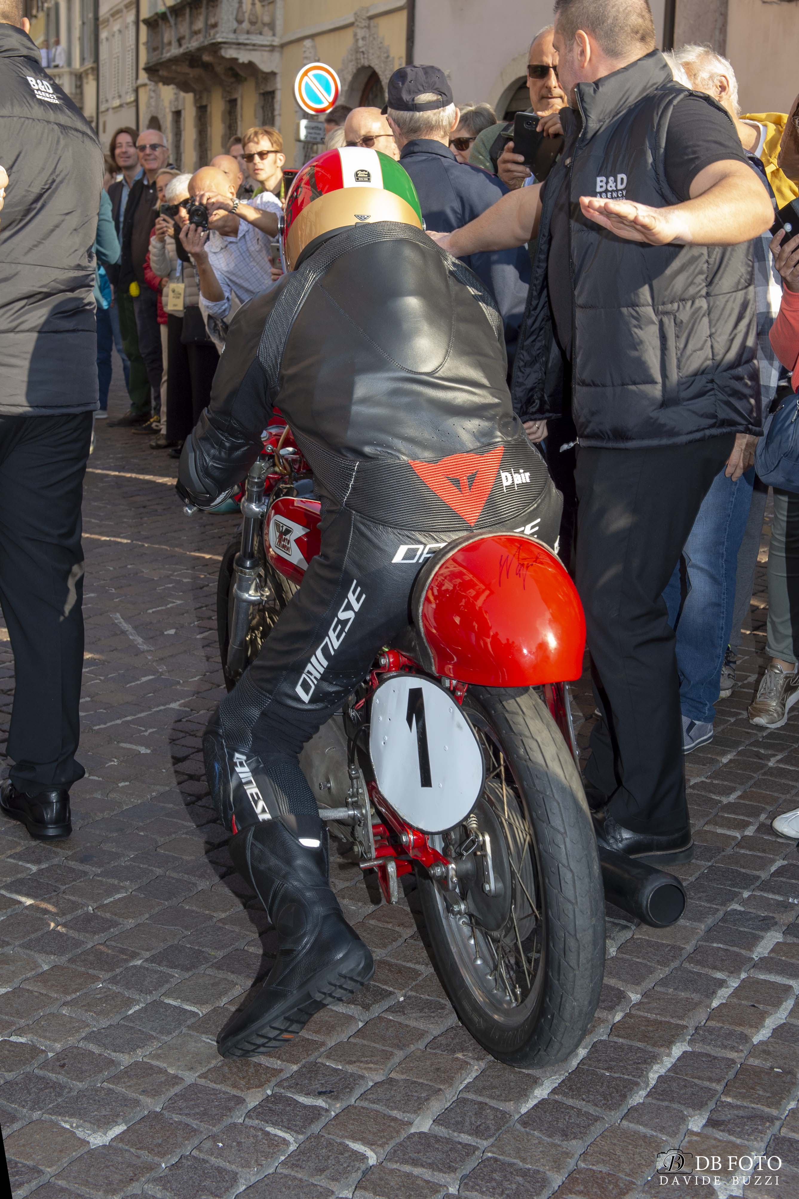 “A Trento mi legano tanti bei ricordi. Speriamo di arrivare in cima, non mi ricordo la strada”, ha scherzato Agostini in mezzo a una ressa di appassionati prima di far rombare il motore e partire lungo via Belenzani.