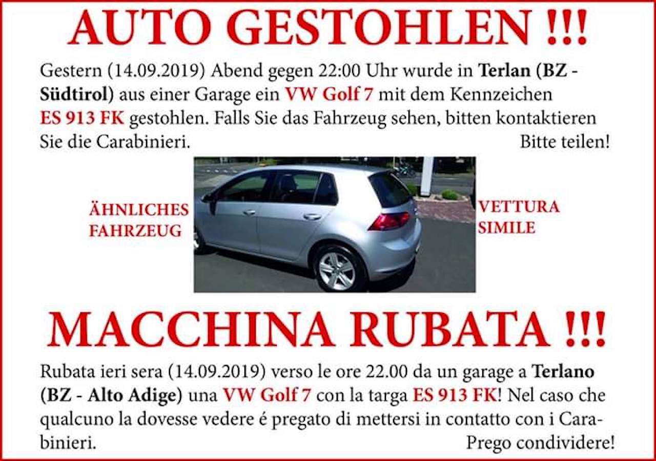 Golf rubata ieri sera a Terlano, l’appello: “Aiutateci a ritrovarla”