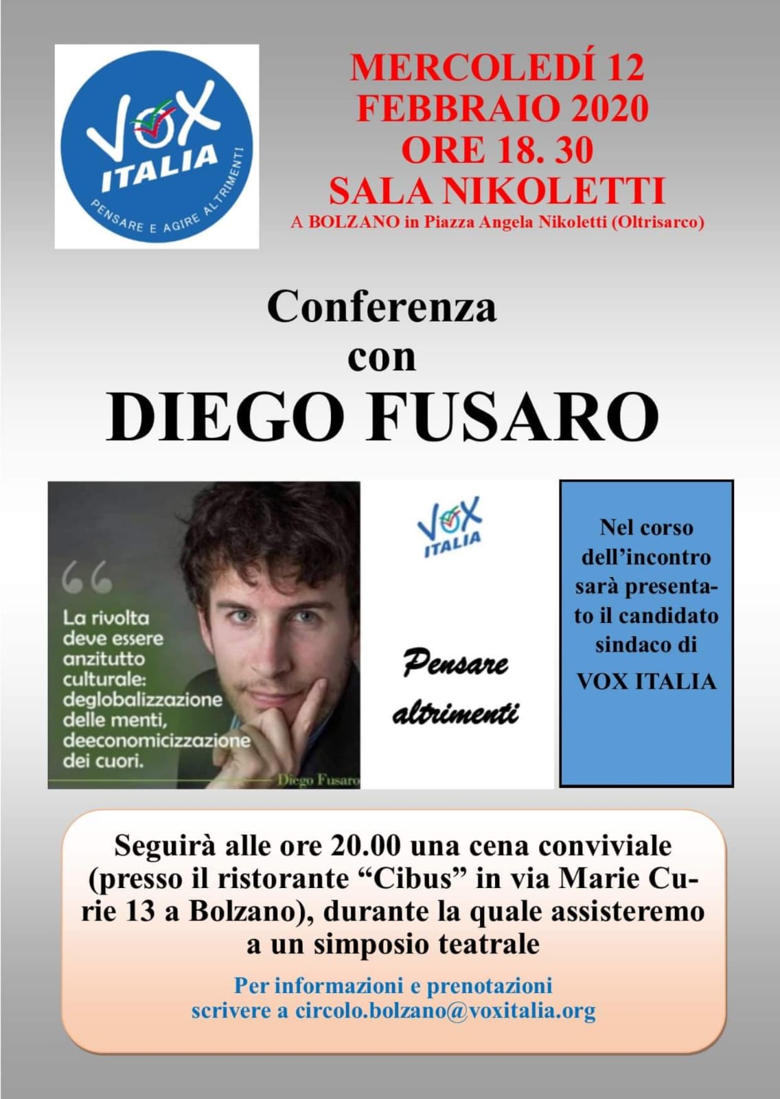 Mercoledì 12 febbraio alle ore 18:30 presso la sala Nikoletti ad Oltrisarco, sarà a Bolzano il filosofo e scrittore Diego Fusaro, ideologo del movimento politico sovranista populista Vox Italia.