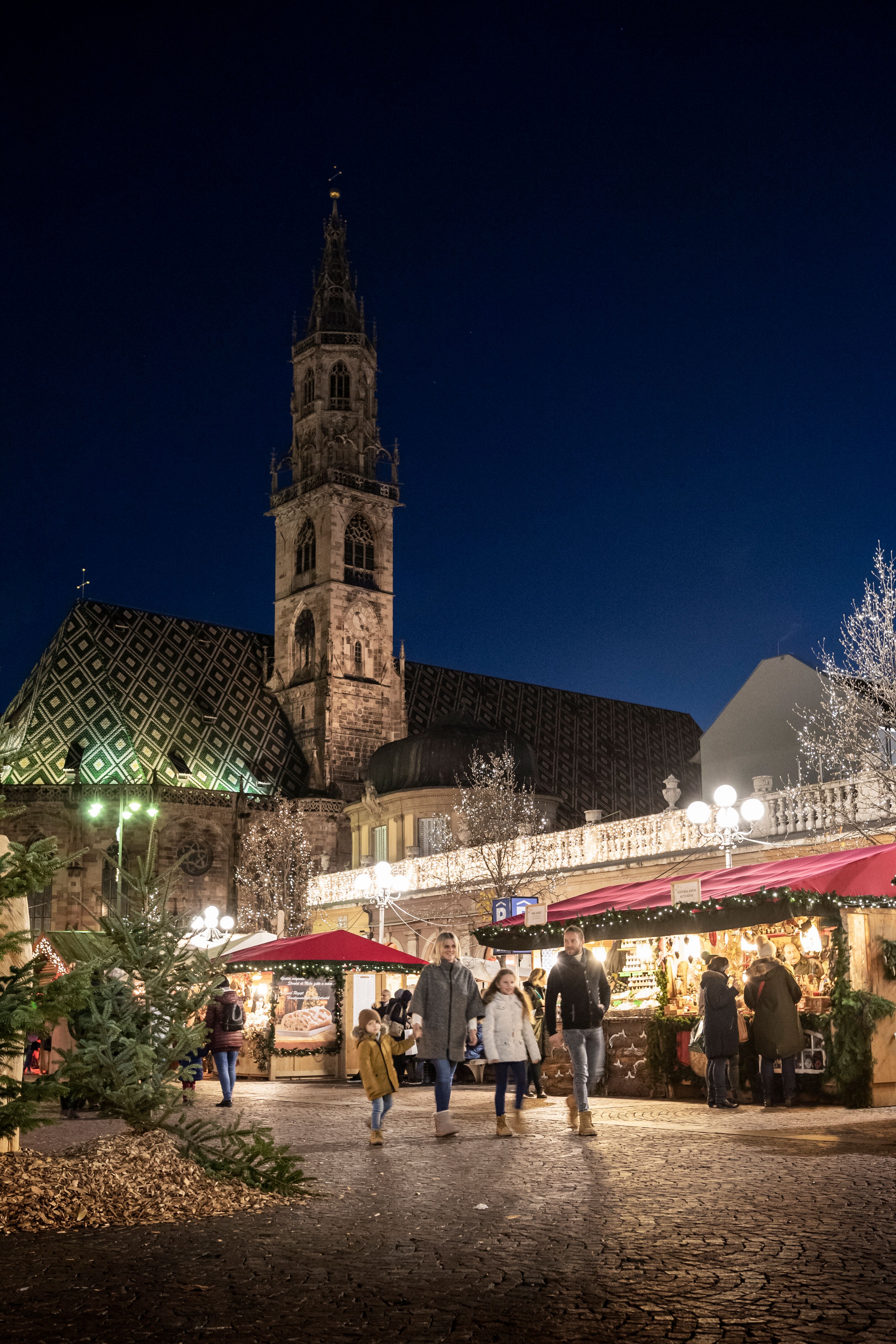 Piazza Walther, il cuore del Mercatino: il tripudio di luci e decorazioni quest’anno si arricchisce di nuovi elementi che fanno da cornice alle vere protagoniste, le casette con il meglio della tradizione artigianale e gastronomica.