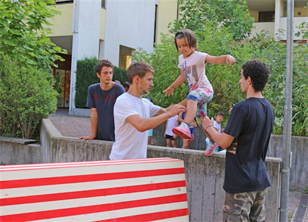 Dal 15 luglio in poi i/le partecipanti (dodici bambini e bambine di età compresa fra i 7 e i 12 anni), hanno ispezionato il quartiere, per scegliere i punti – poi contrassegnati coi colori attrezzati con piccole strutture in legno – nei quali eseguire gli esercizi e le figure del parkour.