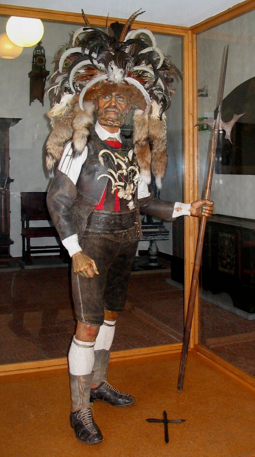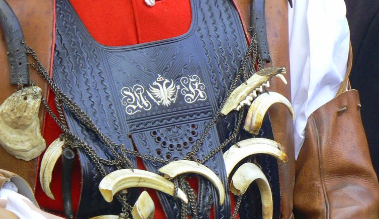 Con il suo imponente copricapo ornato di penne e code di volpe, il “Saltner” è una figura molto nota in Alto Adige, che fa ancora la sua apparizione in alcune particolari occasioni come la festa dell’uva di Merano.
