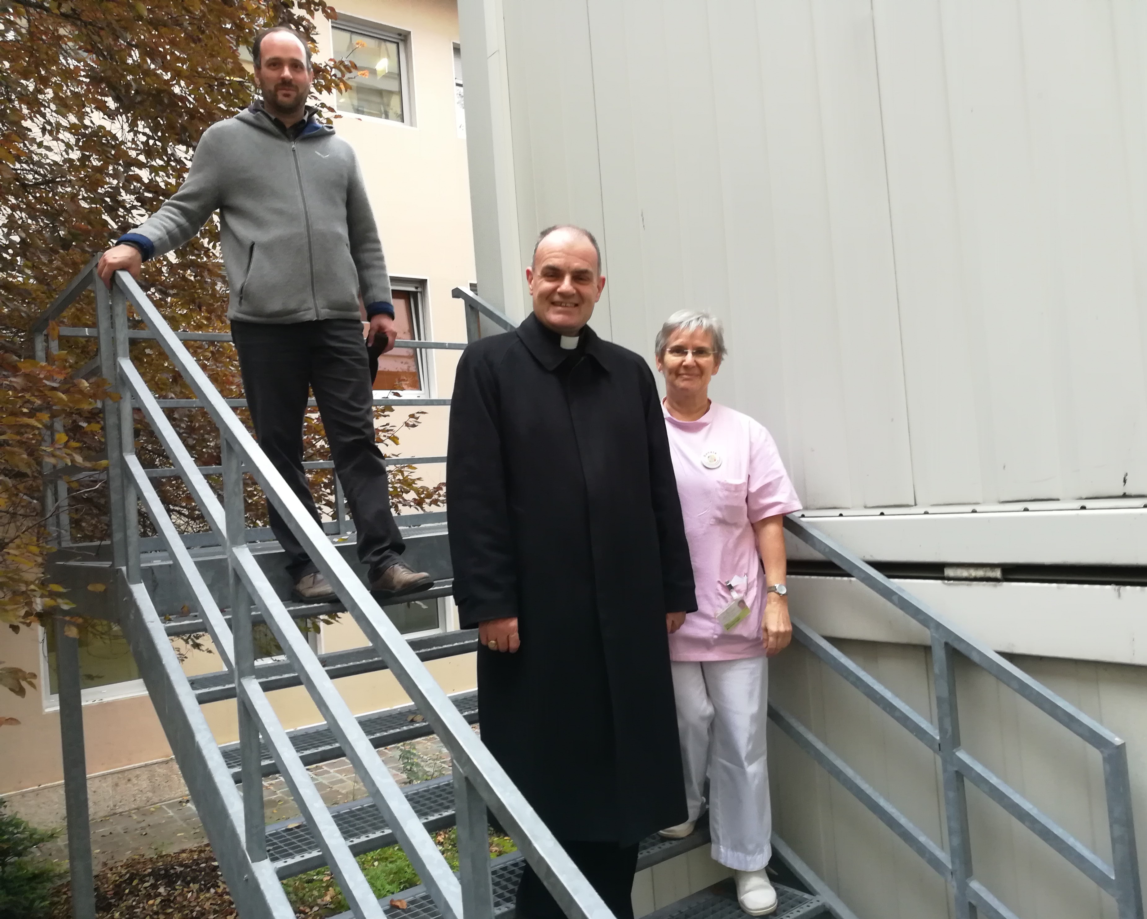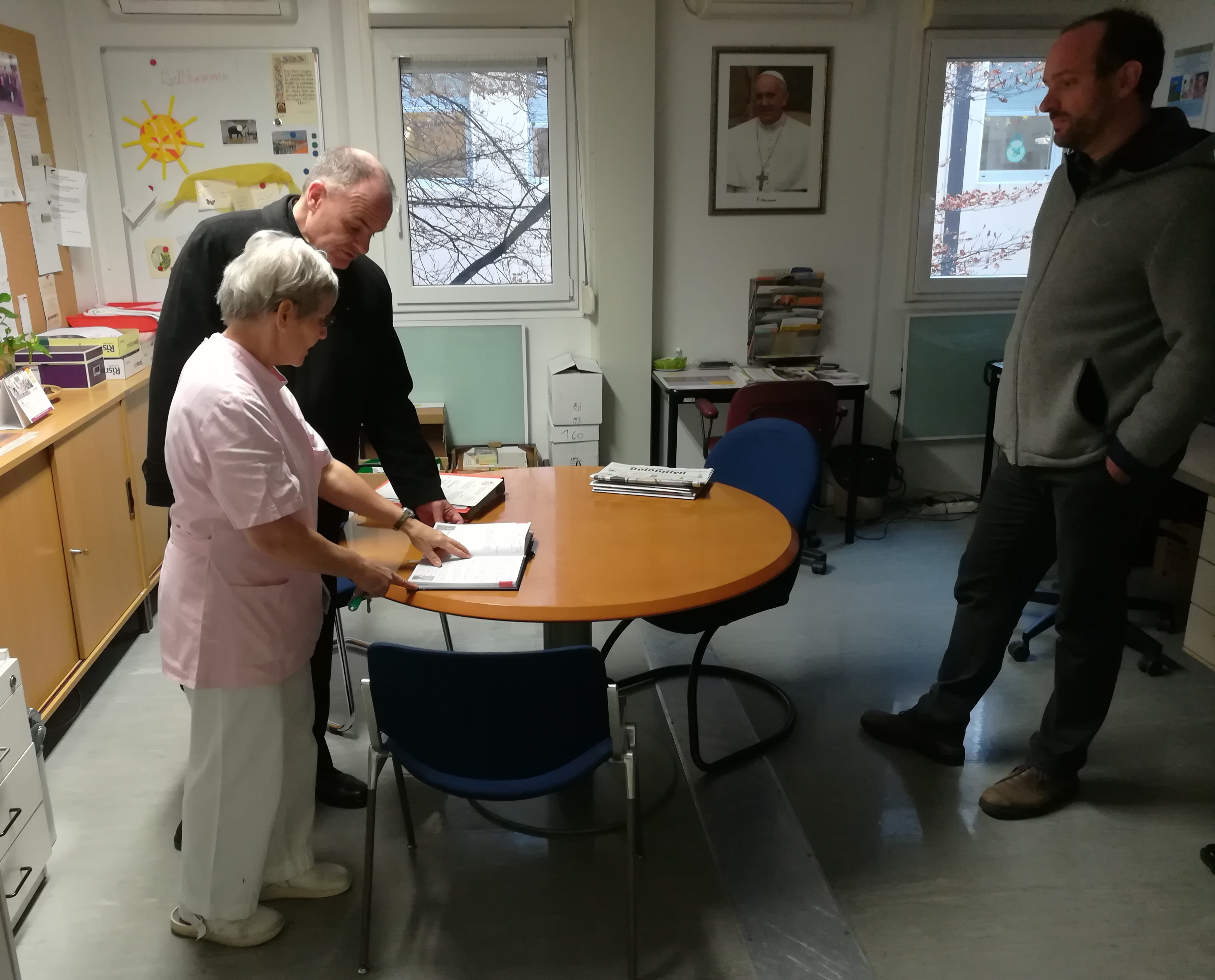 Con la coordinatrice dell’assistenza spirituale all’ospedale di Bolzano, Renate Torggler, il vescovo e il direttore dell’Ufficio pastorale diocesano Reinhard Demetz hanno anche visitato la sede in cui sono sistemati gli operatori, in condizioni non facili: si tratta infatti di locali raggiungibili solo percorrendo un tratto all’aperto nel cortile interno e salendo una scala esterna di ferro. Un percorso non certo agevole per gli utenti del servizio.