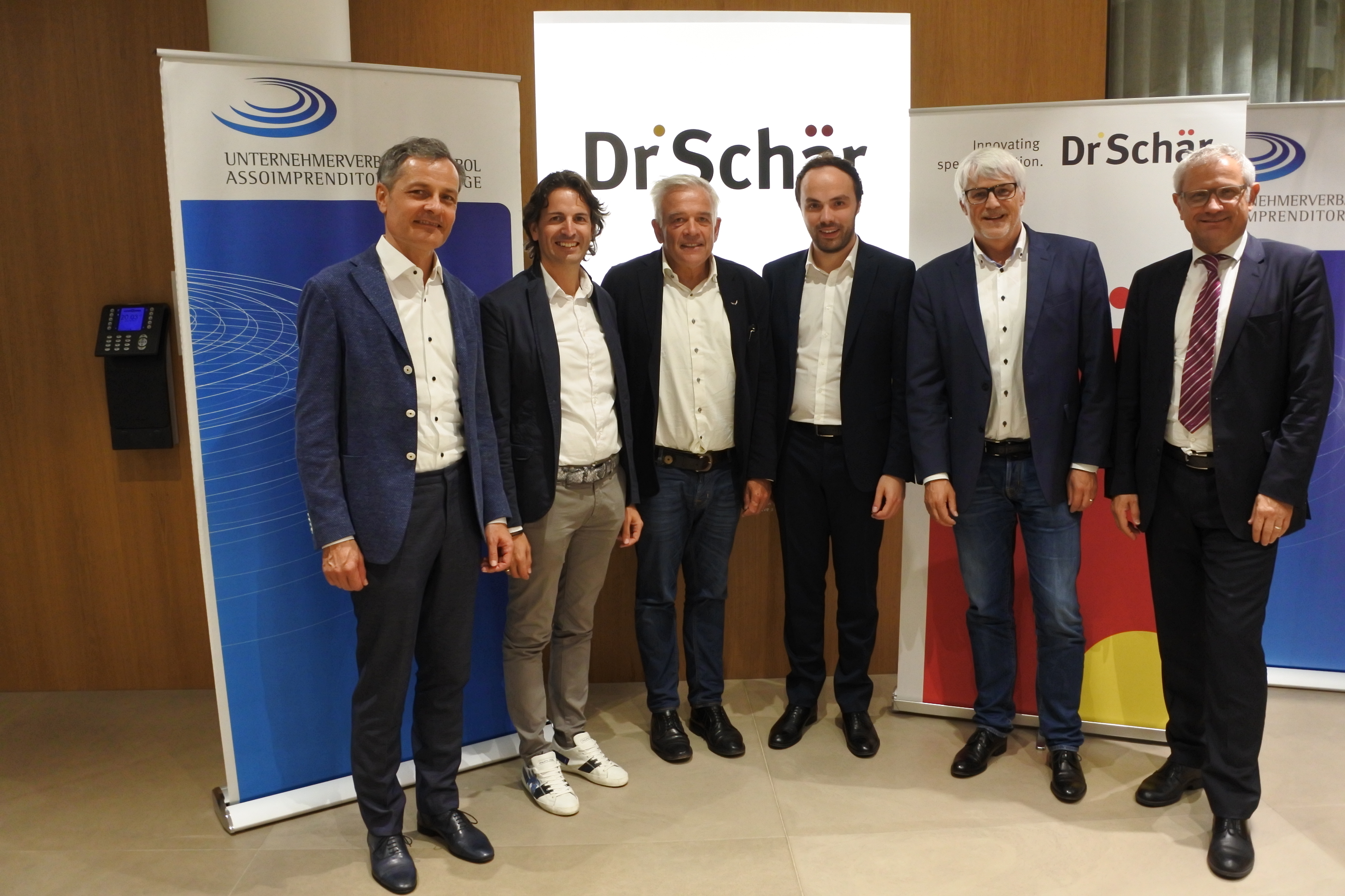 Dopo la presentazione della storia di successo della Dr. Schär da parte del membro del consiglio di amministrazione Richard Stampfl – l’impresa impiega circa 1350 collaboratori in totale, dei quali 400 a Postal e 65 a Laives -, i rappresentanti dei comprensori Norbert Nägele (Burgraviato) e Gustav Rechenmacher (Val Venosta) hanno sottolineato l’importante contributo che le imprese dell’industria e dei servizi connessi all’industria, apportano all’Alto Adige:
