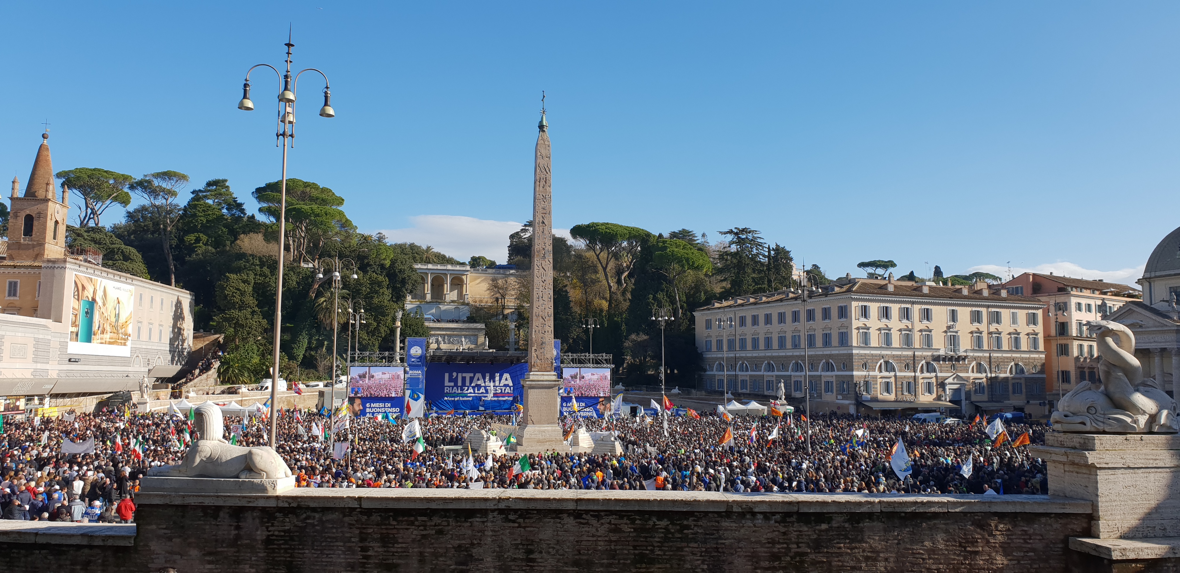 In piazza del Popolo a Roma, sotto il palco, bandiere della Lega e striscioni col sole delle Alpi, ma anche tanti tricolori, un segnale dell’orgoglio che Matteo Salvini ha saputo risvegliare in molti cittadini italiani.