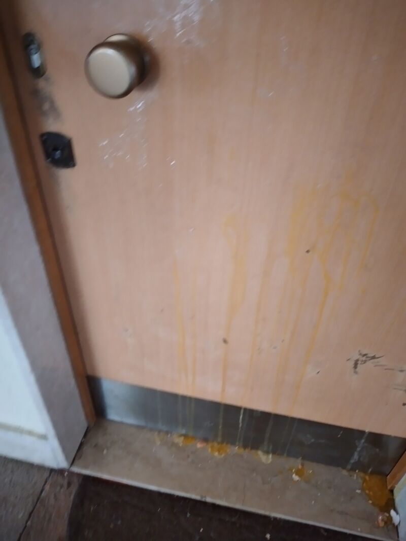 La porta dell’appartamento è stata colpita con le uova riducendola in uno stato pietoso. Dalla foto si vedono anche i segni dei colpi subiti nelle precedenti scorribande dello stesso gruppo ai danni dell’appartamento della copia degli anziani.