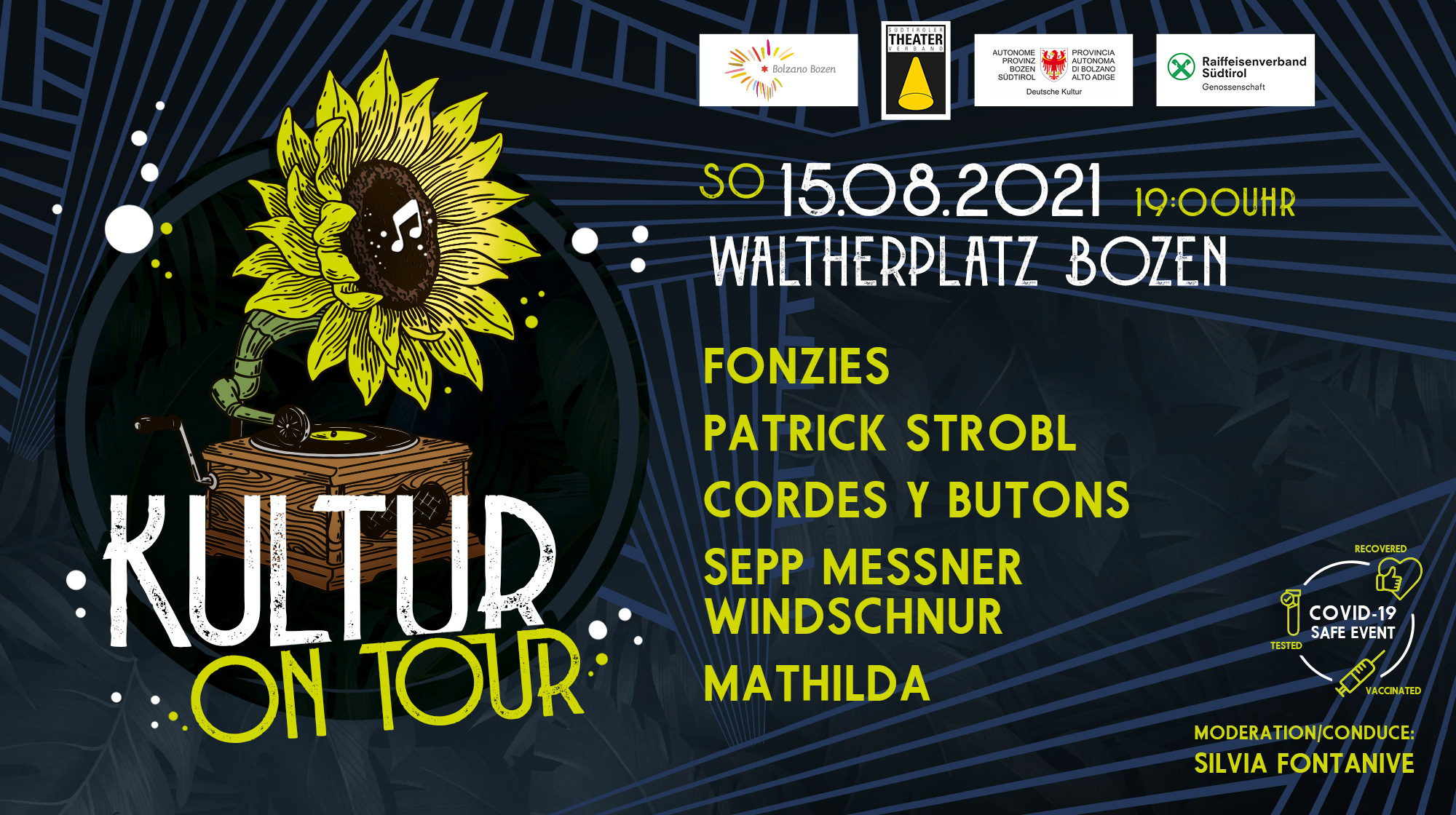 Ospite speciale sarà il cantautore Sepp Messner Windschnur che con le sue canzoni trascinerà il pubblico in un’escursione musicale alla scoperta dei suoni più tradizionali. Il gruppo cover e d’intrattenimento “Fonzies” concluderà la serata con brani degli ultimi 50 anni reinterpretati in chiave personale. A condurre attraverso la serata ci sarà Silvia Fontanive, talentuosa presentatrice ed organizzatrice. Un regalo alla città e ai suoi ospiti per rallegrare nel segno della ripartenza la bella estate bolzanina.