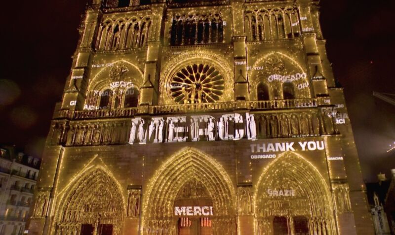 A suggellare l’evento, una grande scritta luminosa al centro della cattedrale: “Merci”, un semplice ma potente ringraziamento per tutti coloro che hanno contribuito a far rinascere Notre-Dame.