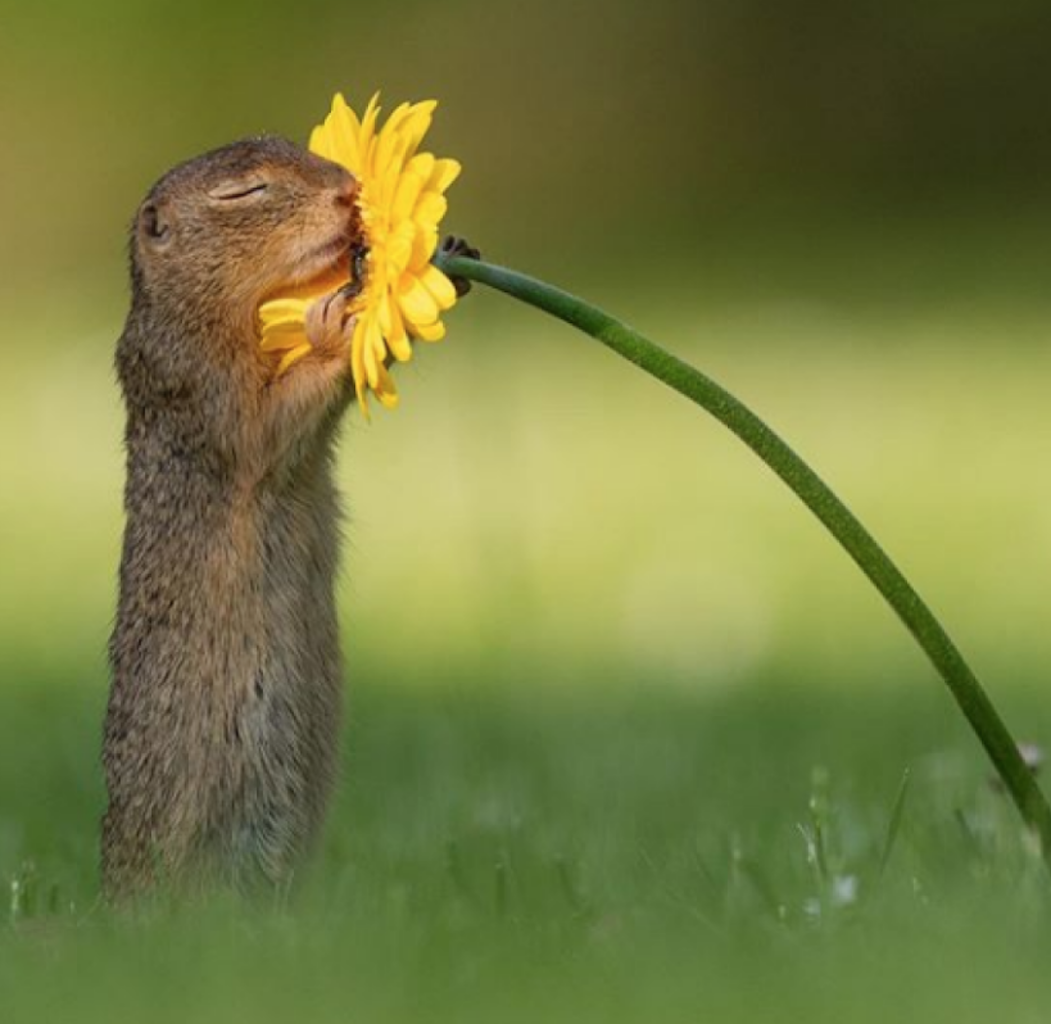 La dolcissima foto dello scoiattolo che annusa i fiori