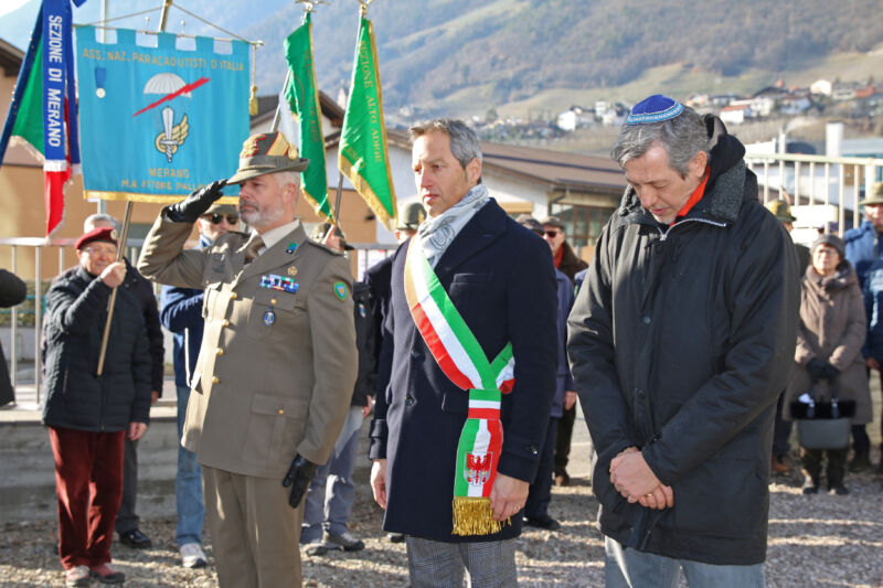 Le due cerimonie si sono svolte alla presenza del sindaco di Merano Dario Dal Medico, del presidente emerito della Comunità ebraica di Merano Federico Steinhaus, del vicepresidente Mirko Wenter, del comandante del Reggimento logistico degli Alpini “Julia“, colonnello Alberto Baessato, nonché di numerose autorità civili e militari.