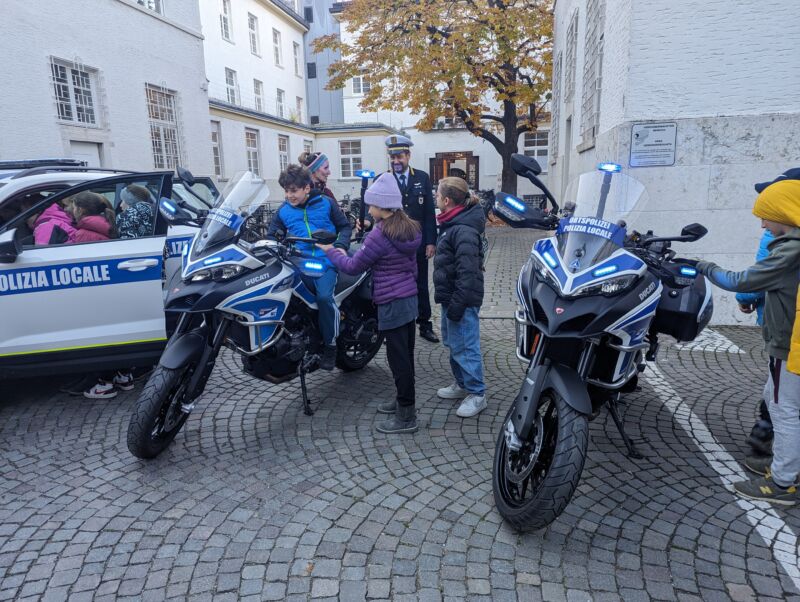 Ai/alle giovani ospiti, accompagnati/e dalle loro insegnanti, Raffeiner, Amorelli e Von Tavonati hanno illustrato i compiti della polizia locale e spiegato le prime regole di comportamento nel traffico e per la prevenzione di incidenti. Poi sono state effettuate anche brevi simulazioni operative, con una “prova” dei vari mezzi della Polizia locale.
