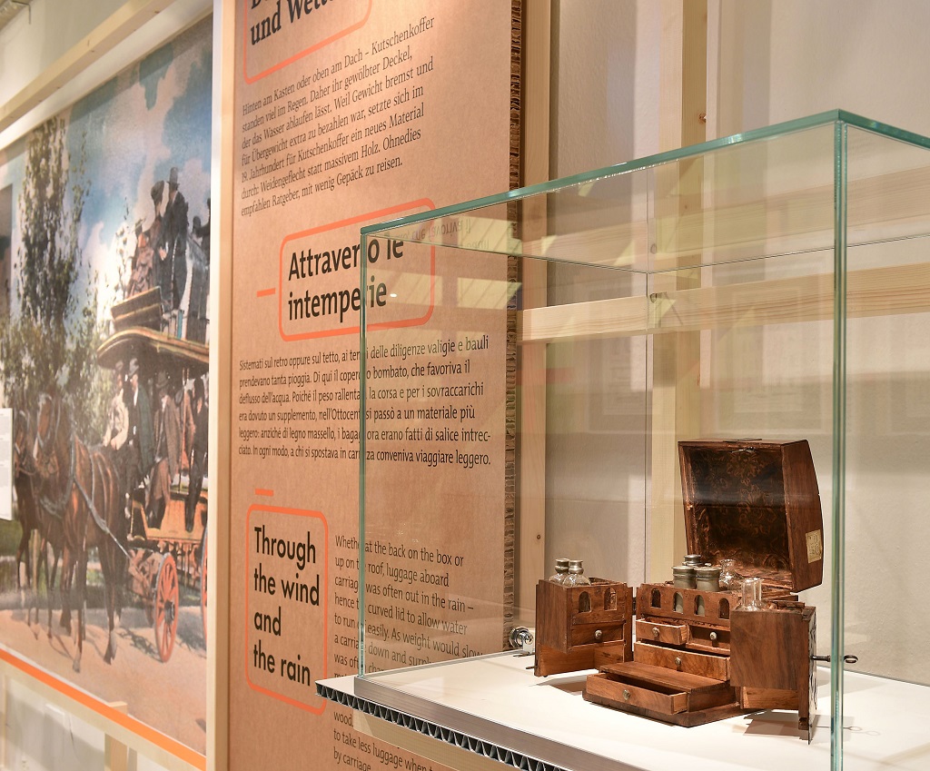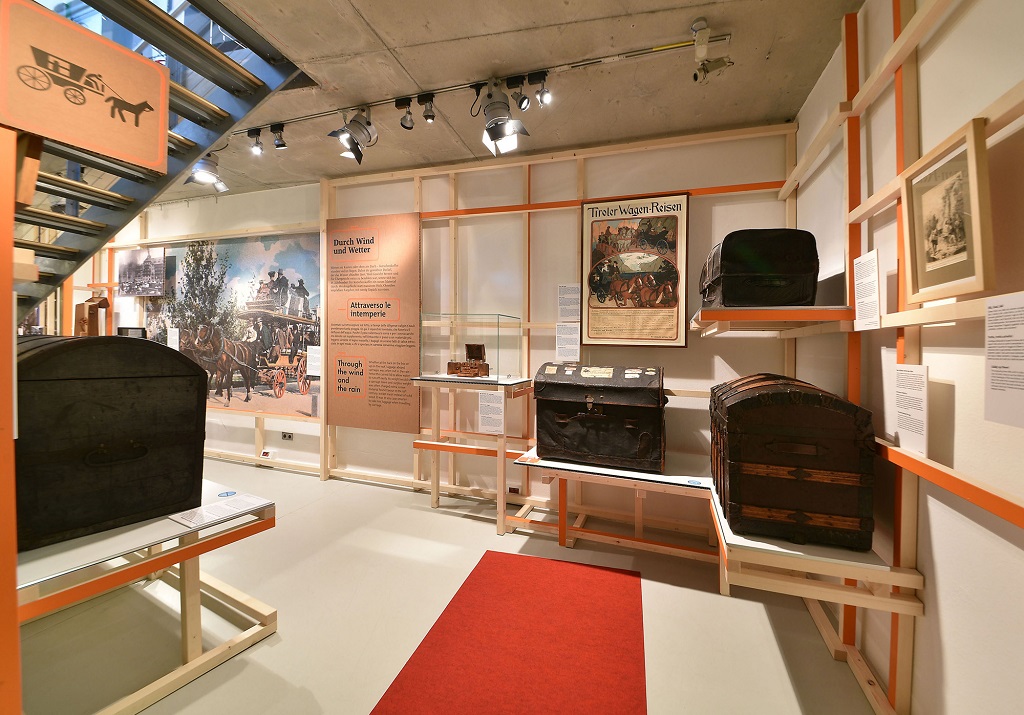 Nella mostra „Borse, trolley e valigie. Viaggio nella storia dei bagagli”, il Touriseum presenta una cinquantina di esemplari della propria collezione finora mai esposti. Bauli da carrozza, bauli armadio, sacche da viaggio, cappelliere, nécessaire, zaini, borse per chi si sposta in macchina e trolley narrano di romanzesche corse in diligenza attraverso le Alpi, eleganti villeggiature in grand hotel, avventurosi giri del mondo in bicicletta e partenze verso una nuova vita, senza trascurare le quotidiane fatiche dei facchini, i sacrifici di chi parte soldato e la disperazione di chi è costretto a una fuga precipitosa.