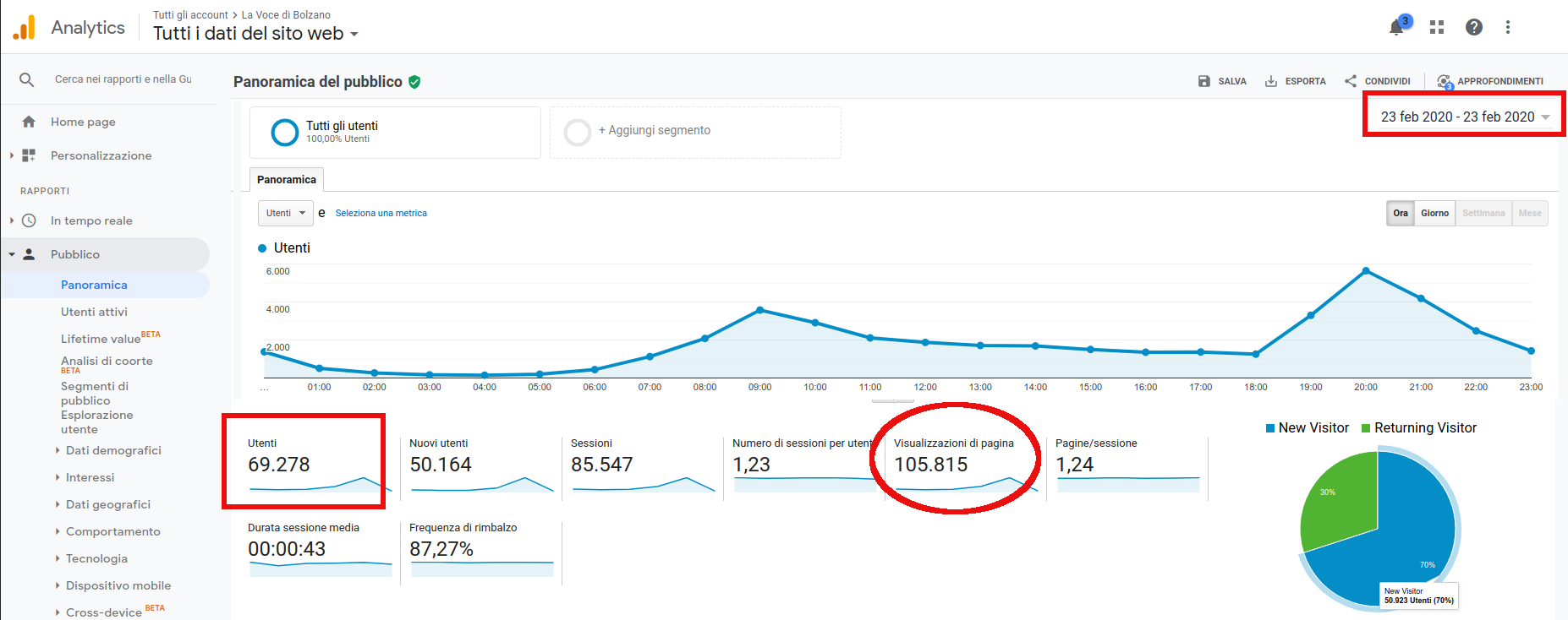 La Voce di Bolzano fa numeri da record. Solo nella giornata di ieri (23 febbraio) il quotidiano online più letto in Alto Adige ha raggiunto in sole 24 ore quasi 106mila pagine lette (sotto il report di Google Analytics).