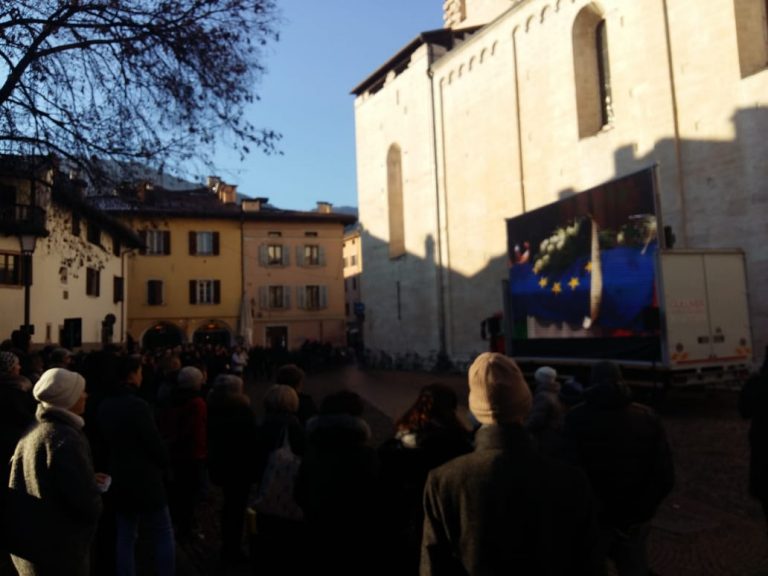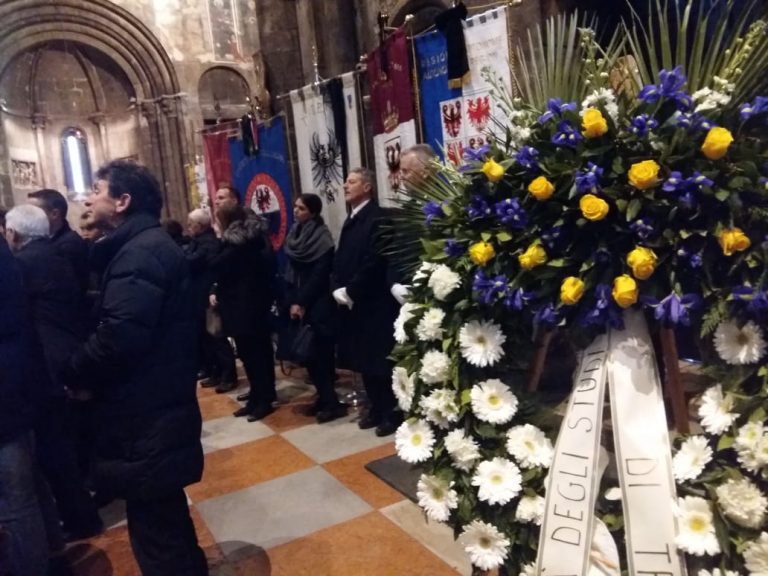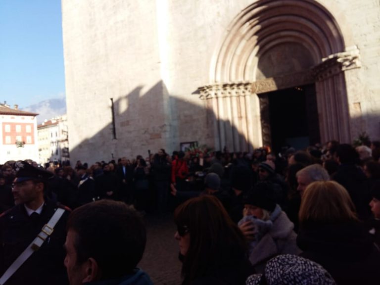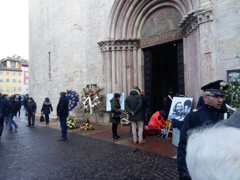 Ore 14.00 – La chiesa è stracolma in ogni ordine di posti ed addobbata con numerosi stendardi fra cui quelli di «Trentino Europa italia», «Università di Trento», «Città di Reggio Calabria», del Procuratore della Repubblica Sandro Raimondi, di Walter Kaswalder, Ugo Rossi e il presidente del consiglio regionale Roberto Paccher.