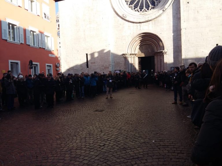 Ore 13.55 – Piazza del Duomo è tappezzata di foto che raffigurano il reporter Trentino ucciso dal terrorista a Strasburgo. Intorno alla Piazza blindata dalle forze di Polizia c’è in silenzio assordante, lo sgomento, il dolore e l’indignazione di chi ha deciso di portare l’ultimo saluto ad Antonio.