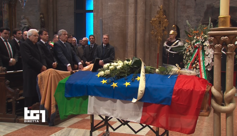 Ore 14.27 – Dopo le condoglianze alla famiglia le personalità politiche hanno preso posto in attesa dell’inizio della messa (immagini Raiuno)