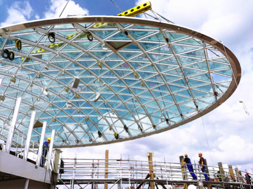 Completata la fase di montaggio, la struttura in vetro è stata sollevata sul 18° ponte della nave in un’unica operazione con l’ausilio di una gru mobile da 750 tonnellate. Si tratta del primo tetto a cupola di vetro di queste dimensioni mai costruito per una nave. Cuore architettonico della nave da crociera, questo innovativo skydome si estende a copertura del grande atrio sui ponti 16 e 17, inondandolo di luce naturale. Al di sotto della cupola verranno realizzati ristoranti, bar, una piscina e un palcoscenico.