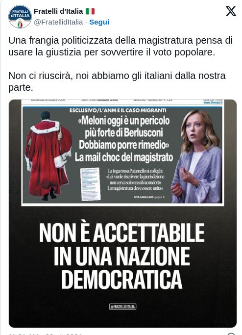 Nel messaggio, pubblicato sul Tempo, Patarnello sottolinea come l’attacco alla giurisdizione, secondo lui, non sia mai stato così forte, nemmeno ai tempi di Berlusconi, poiché Meloni agisce per motivazioni politiche e non personali.
