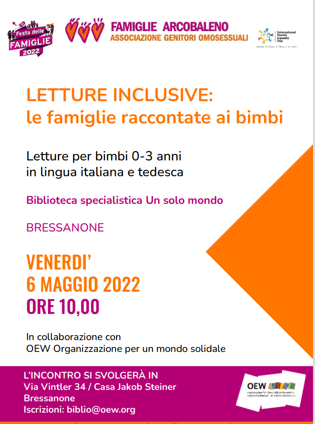 L’associazione LGBT “Famiglie Arcobaleno” con la collaborazione di “OEW Organizzazione per un mondo solidale” ha inviato a tutte le scuole dell’infanzia in lingua tedesca ed italiana di Bressanone l’invito ad un evento che si terrà il 6 maggio nel quale, attraverso la lettura di libercoli gender come “Piccolo uovo” e di giochi non meglio specificati, si propinerà ai bambini il solito repertorio ideologico dell’attivismo gay.