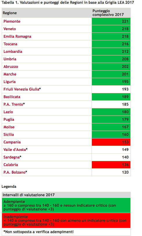 Prime in classifica, come da griglia sotto riportata, risultano Piemonte, Veneto, Emilia Romagna, Toscana, Lombardia, Umbria, Abruzzo e Marche.