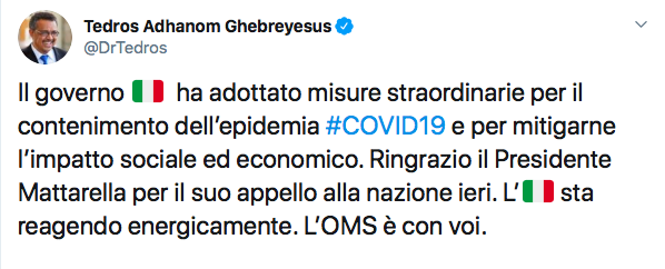 Aveva infatti Twittato il 6 marzo: “Il Governo ha adottato misure straordinarie per il contenimento dell’epidemia #COVID19 e per mitigarne l’impatto sociale ed economico. Ringrazio il Presidente Mattarella per il suo appello alla nazione ieri. L’Italia sta reagendo energicamente. L’OMS è con voi“.
