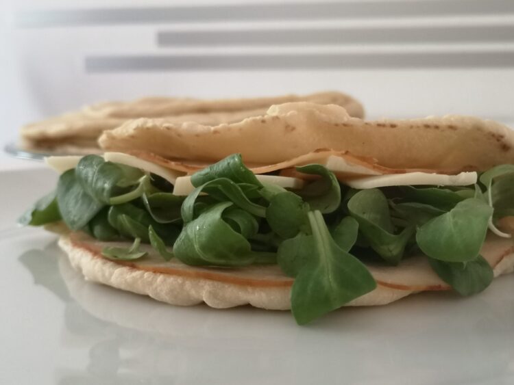 Quando le piadine sono fredde farcire con una fetta di fesa di tacchino, un pugnetto di valeriana e fette sottili di formaggio (io ho usato dell’asiago).