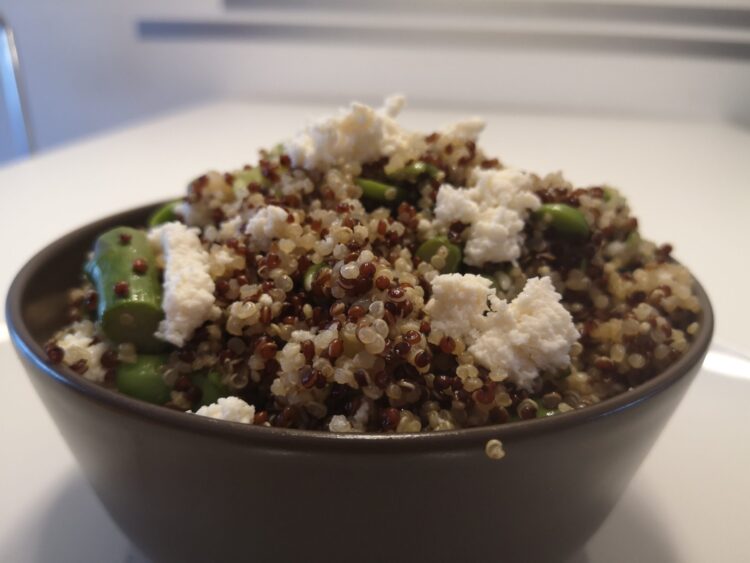 A parte sbollentare le fave precedentemente sgusciate. A cottura ultimate versare nella pentola delle zucchine la quinoa e le fave, mescolare e trasferire nel piatto da portata, ultimando il piatto con della feta spezzettata.